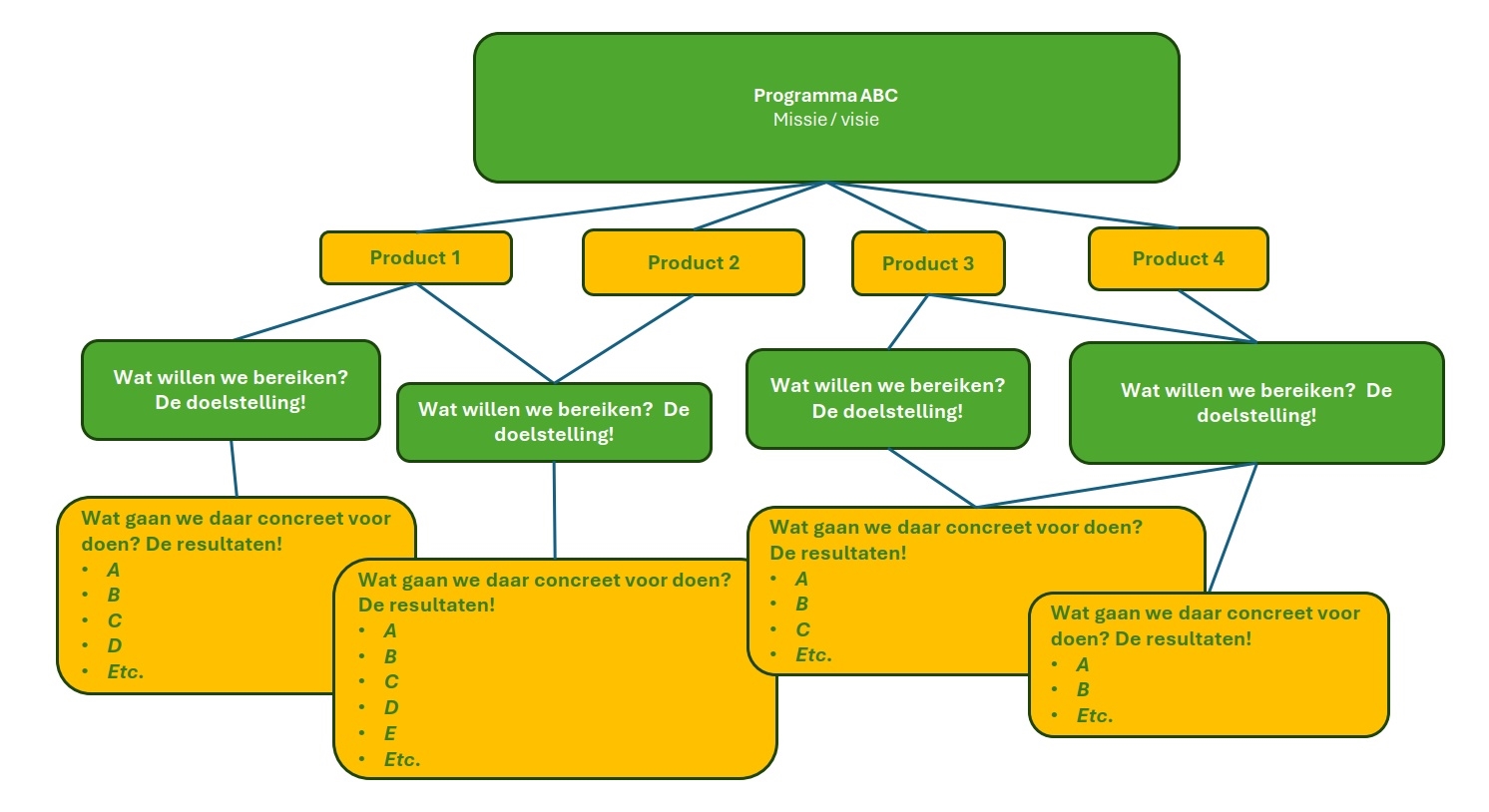 In 2024 hebben we een nieuwe Planning & Control tool in gebruik genomen: Pepperflow. De begroting 2025 hebben we al opgezet met die tool, die van 2024 nog niet. Desondanks maken we de jaarstukken 2024 toch op binnen Pepperflow. Daarvoor hebben we eerst de programma’s van de begroting 2024 in een duidelijkere P&C structuur gezet door de concrete doelen (kaders) en inspanningen (uitvoering) er uit te filteren en vooral de resultaten daarop te verantwoorden. Visueel ziet die structuur er als volgt uit: